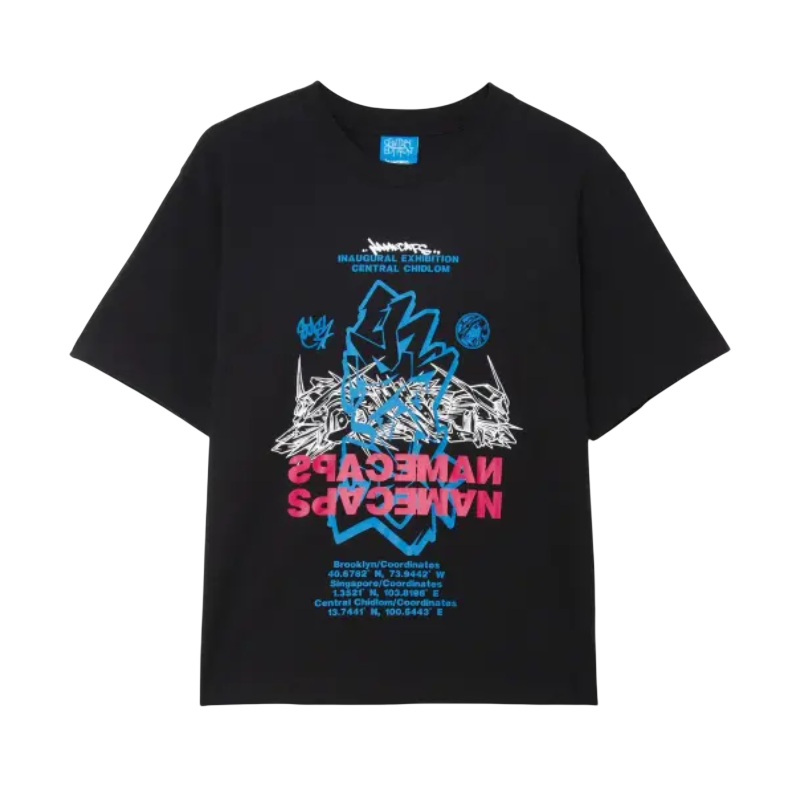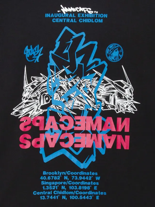 นิทรรศการนี้เน้นย้ำถึงความแตกต่างของเวลา 12 ชั่วโมงระหว่างบรู๊คลินและสิงคโปร์ โดยใช้ความแตกต่างทางเวลานี้เพื่อสำรวจธีมเกี่ยวกับอวกาศและเวลาในบริบทของโพสต์กราฟฟิตี้ Namecaps: Spaceman สะท้อนการเดินทางทั่วโลกของกราฟฟิตี้ โดยบันทึกการพัฒนาของมันจากการกระทำในท้องถิ่นที่เป็นการก่อการร้ายไปสู่ภาษาสากล การสนทนาระหว่างโซนเวลา วัฒนธรรม และแนวทางศิลปะ มองไปสู่อนาคตที่กราฟฟิตี้จะขยายตัวมากขึ้น ข้ามขอบเขตของเวลา อวกาศ และจินตนาการ ไปสู่โลกของสเปซแมน